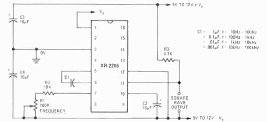 We found this circuit in the April 1977 issue of Radio Electronics magazine. The circuit generates square signals in the frequency range that depends on C1. The values are given next to the diagram.