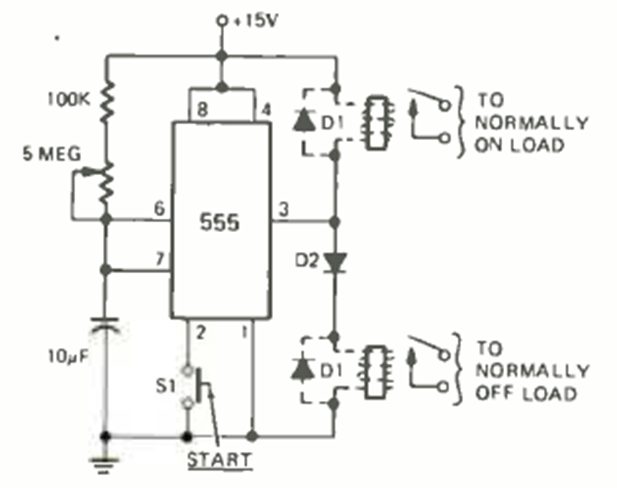 This circuit from a Radio Electronics from February 1976 activates the relay in two different ways depending on whether it is turned on or off at the end of the timing. Sensitive relays must be used to avoid loading the 555 output.The time ranges from 1 second to 1 minute.