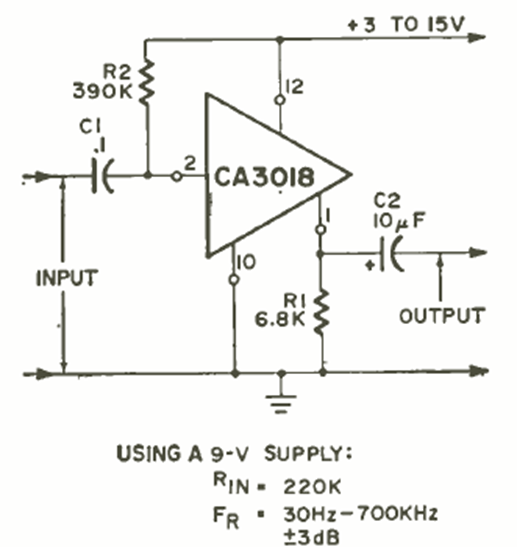 This amplifier with RCA's newly released CA3018 integrated circuit was found in the August 1970 issue of Radio Electronics magazine. The specifications are listed next to the diagram.