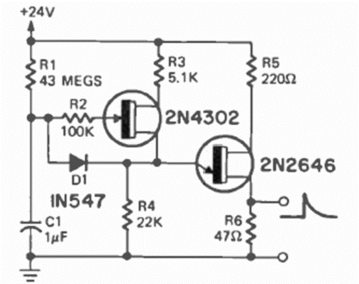 This long delay circuit was found in the July 1973 Radio Electronics magazine. The capacitor determines the delay. The unijunction transistor is well known, and the bipolar transistor can be any general-purpose FET.