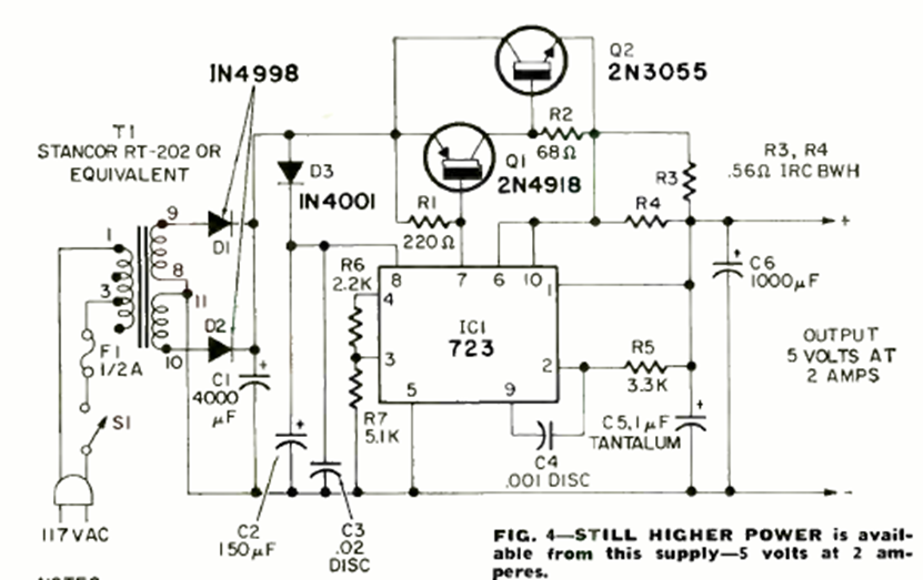 Using the 723 integrated circuit, this circuit was obtained from an article in the August 1971 Radio Electronics magazine. Transistor Q1 can be the BD136 and the 2N3055 must be equipped with a heat sink.