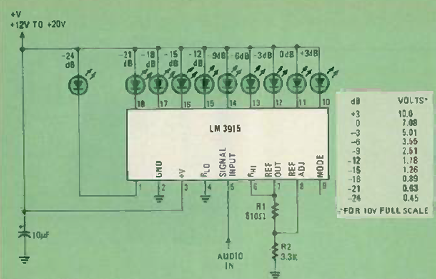 This audio level indicator was found in October 1980 Radio Electronics magazine. See the table with the dB values of the indicated signals.