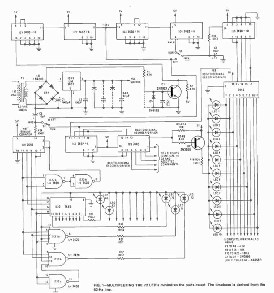 This interesting circuit in which the LED display is circular imitating a common clock appeared in the Radio Electronics magazine of May 1977. The power supply is included.