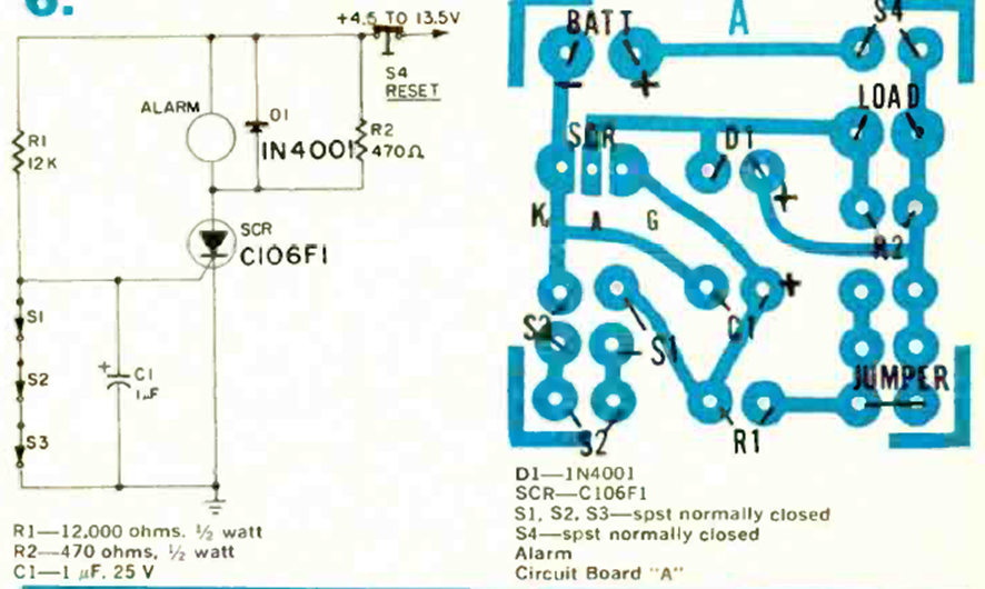 This alarm circuit with NC sensors in series was taken from an article in Radio Electronics magazine from May 1971. The SCR can be any of the 106 series.