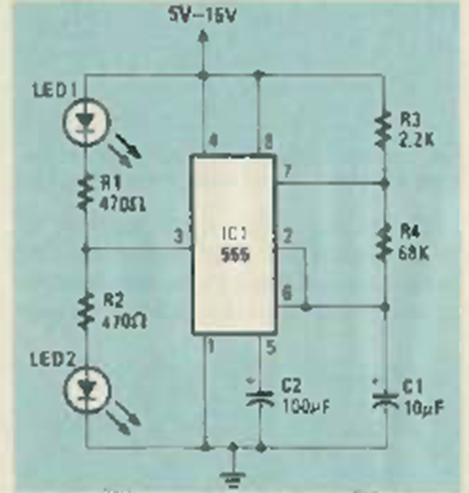 This flasher was found in the September 1984 Radio Electronics magazine. The frequency is given by resistors C1 and C2. The LEDs flash alternately.