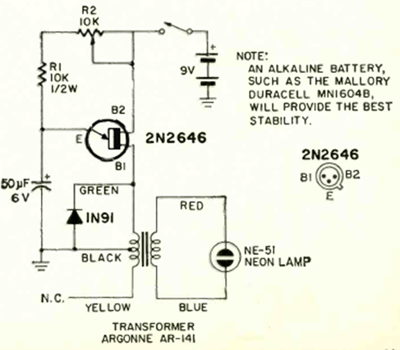This circuit with neon lamp and unijunction was found in the September 1970 Radio Electronics magazine. The transformer must have a high voltage primary connected to the neon lamp.
