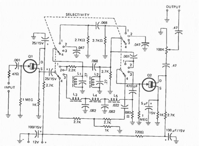 This sophisticated filter for audio signals was found in Radio Electronics magazine. The frequencies are determined by LC circuits. The circuit has selectivity selected by a switch.
