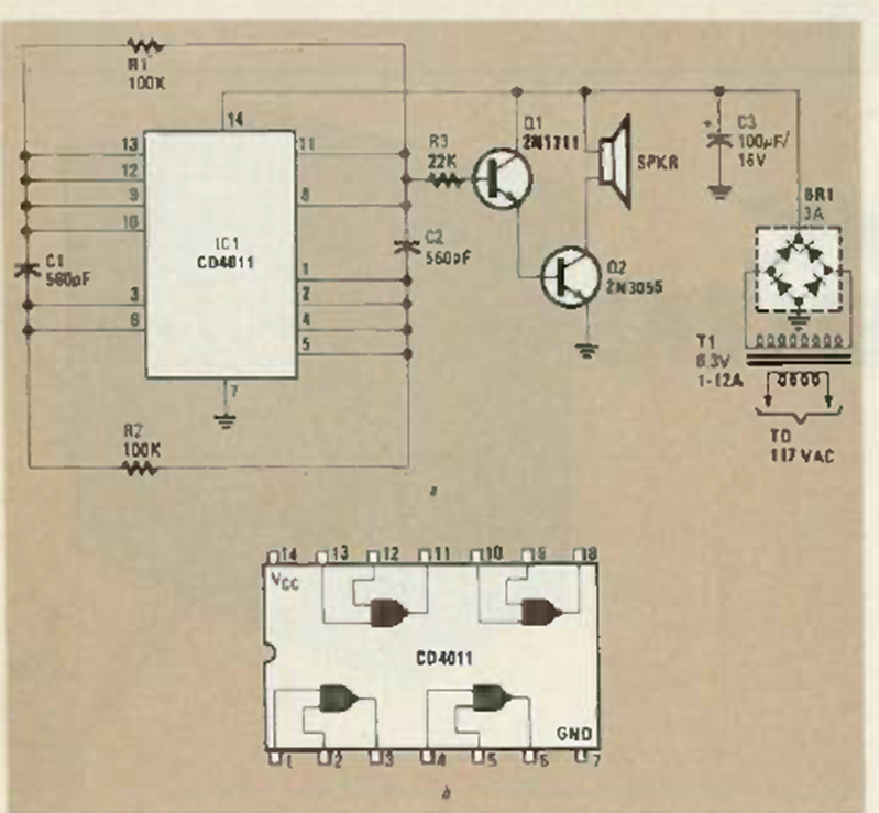 This circuit has more power than the previous one, since it includes a powerful transistorized stage. The circuit is from Radio Electronics from July 1985. It includes the power supply.