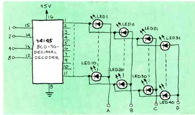 This TTL circuit is from a Radio Electronics magazine from November 1983. The circuit drives a set of LEDs. The integrated circuit used is a BCD to decimal decoder.