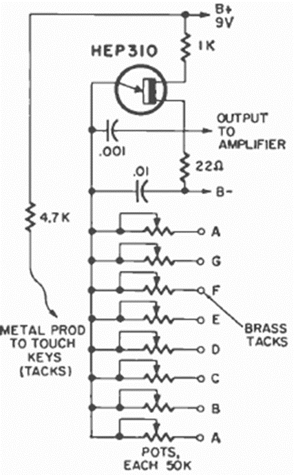 Circuits of the same type can be found in this section from various publications. This one is from a Radio Elecronics magazine from April 1971. It should be connected to the input of an amplifier.