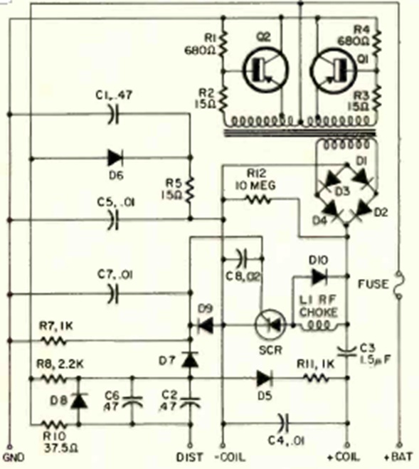 This circuit is from a Radio Electronics from April 1972. The circuit uses power transistors of the time and is used in cases with contact breaker cars.
