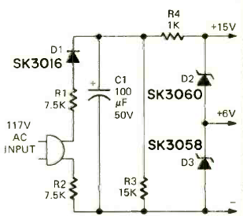 This low-current power supply was found in the April 1973 issue of Radio Electronics magazine. The circuit uses a resistive choke, a 7.5k wire-wound resistor, and period diodes.