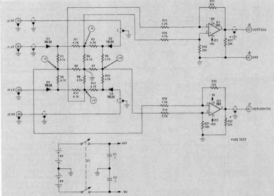 This signal multiplexer circuit for early low-frequency oscilloscopes was found in the May 1977 issue of Radio Electronics magazine. The circuit requires a symmetrical source.