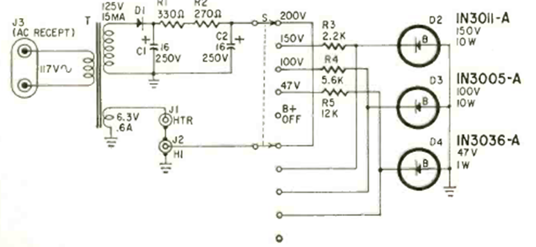 This circuit was obtained from the July 1970 issue of Radio Electronics magazine. Zeners are power types that can provide a good current to the circuit. Selection is made by rotary switch.