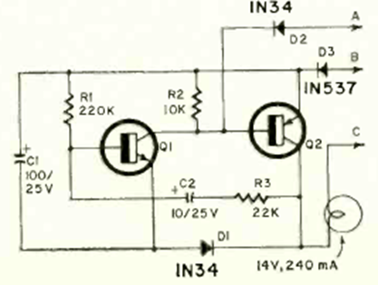 This headlight reminder for your car was found in the May 1970 issue of Radio Electronics magazine. The circuit uses general-purpose transistors of the time and a bulb that can be replaced with LEDs.