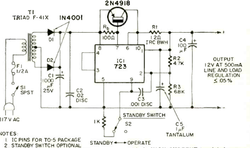 Using the integrated circuit 723 we found this power supply in an article in the magazine Radio Electronics from August 1971. The transistor may be a BD136 equipped with a heat sink.