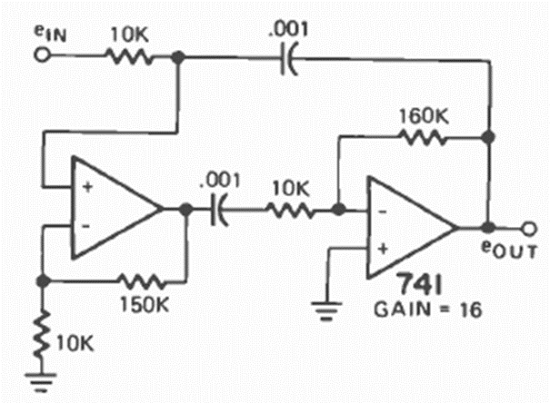 This filter with the 741 has a Q factor of 8 at the frequency of 1 kHz. The circuit is from a Radio Electronics from November 1973. The operational one is the 741 or equivalent.
