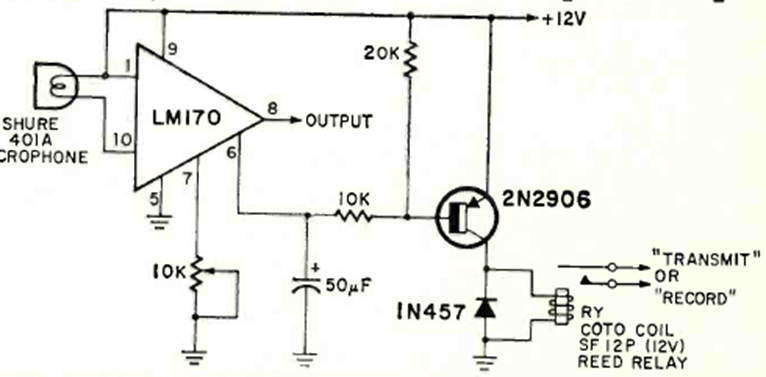 Using the LM170 integrated circuit, this circuit was found in the May 1970 Radio Electronics magazine. The transistor is general-purpose, and the potentiometer adjusts the gain.
