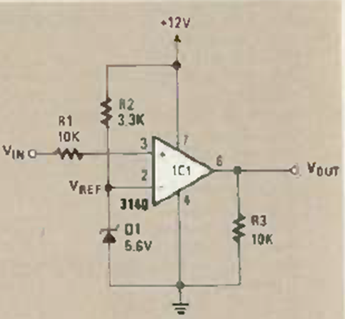 The circuit with a common operational amplifier uses a zener as a reference. The circuit is from Radio Electronics from June 1986. The input used is the non-inverting one.
