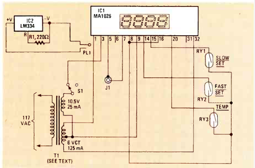 This digital thermometer circuit with MA1026 module was found in February 1981 Radio Electronics magazine. Note the special transformer voltages.