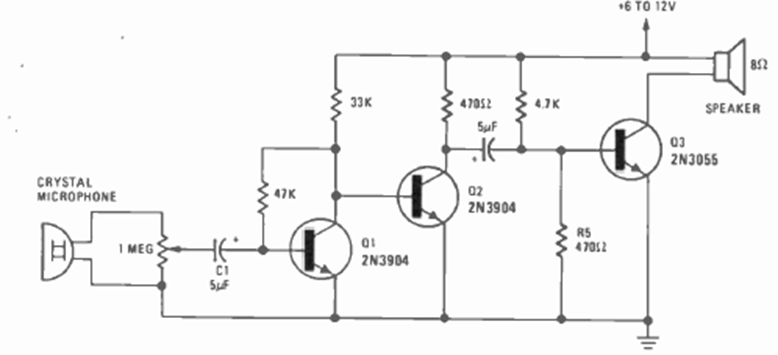 This simple amplifier uses a microphone attached to the telephone. The 3-transistor circuit was found in the May 1977 issue of Radio Electronics magazine. It can be powered by a power supply or battery.