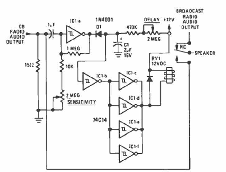 This audio-driven relay was published in the July 1977 issue of Radio Electronics magazine. The circuit uses CMOS components, and the relay must be a sensitive type.