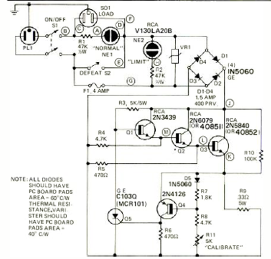 We found this circuit in the March 1976 Radio Electronics magazine. The circuit is very interesting because it uses transistors to detect excess current.