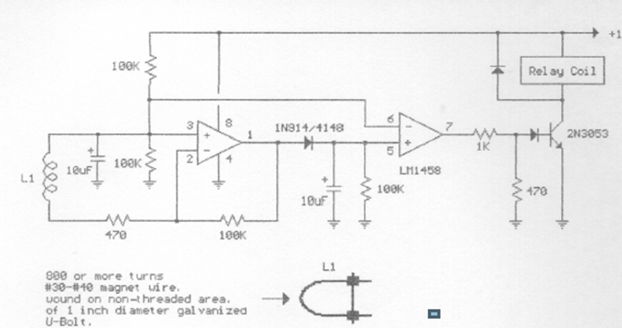 Found in documentation from the 90s, this circuit triggers a relay with inductive signals applied to a link. The sensitivity depends on the frequency and the power supply depends on the relay used.