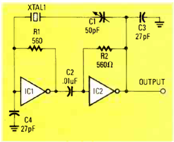 Any TTL inverter can be used in this circuit. We found it in documentation from the 80s, but it still works today, and must be powered with 5 V.