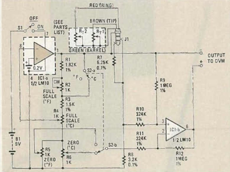 This circuit was found in the June 1985 issue of Radio Electronics magazine. The idea is to use a common multimeter to measure temperatures. The sensor is an LM10 integrated circuit. The circuit measures from 0 to 100º using an analog multimeter.