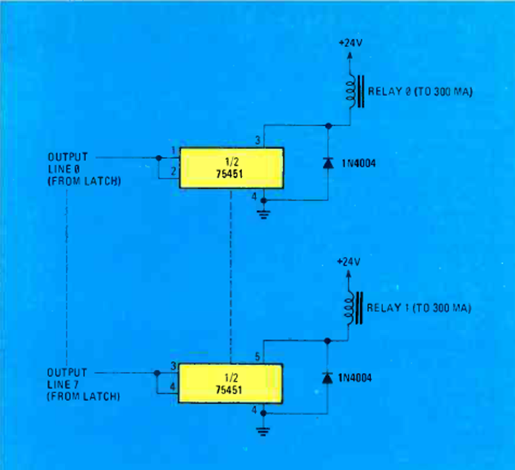 This relay shield circuit for old computers was found in January 1983 Radio Electronics magazine. The relays are sensitive types with currents up to 200 mA.