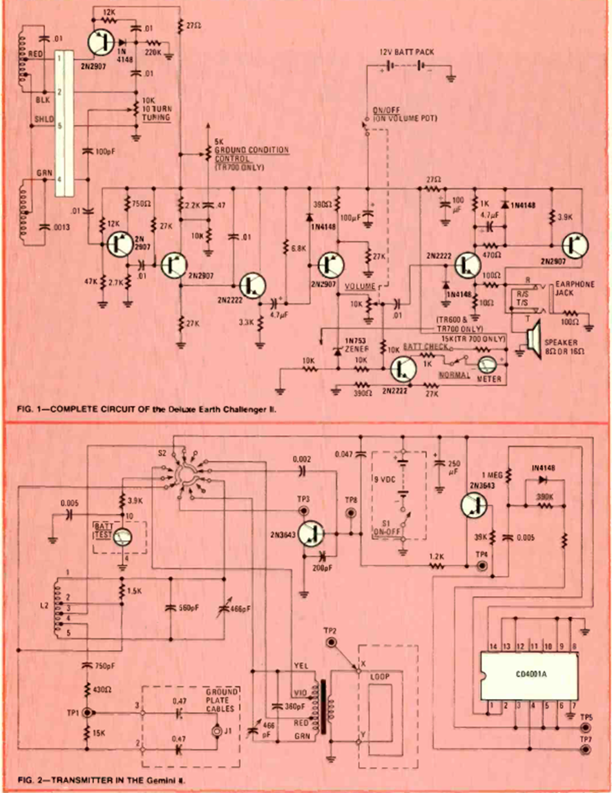 This sophisticated metal detector was published in the November 1980 issue of Radio Electronics magazine. The original article gave details of the coils to operate at a frequency of several hundred kilohertz. The receiver is the next circuit.