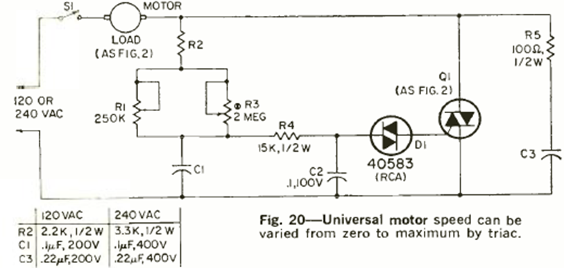 This triac circuit was taken from an article in the July 1970 Radio Electronics magazine. Note the snubber formed by R5 and C3 for controlling inductive loads.