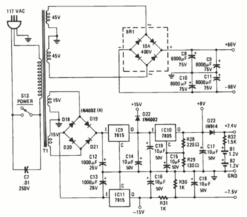 This is the power supply for the amplifier in the previous circuit. The voltage regulators must be equipped with a heat sink and the transformer is high current.