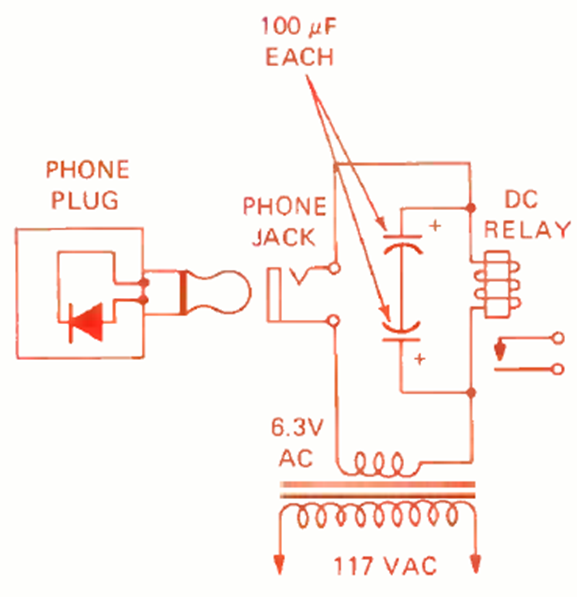 In this circuit, a jack with a diode activates a relay in a security system. The circuit is from a Radio Electronics magazine. The relay is rated according to the transformer voltage.
