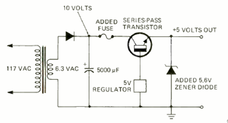 This circuit is designed to force a current greater than that of the fuse onto the transistor in case of problems, burning it for protection. We found it in a Radio Electronics magazine from October 1972.