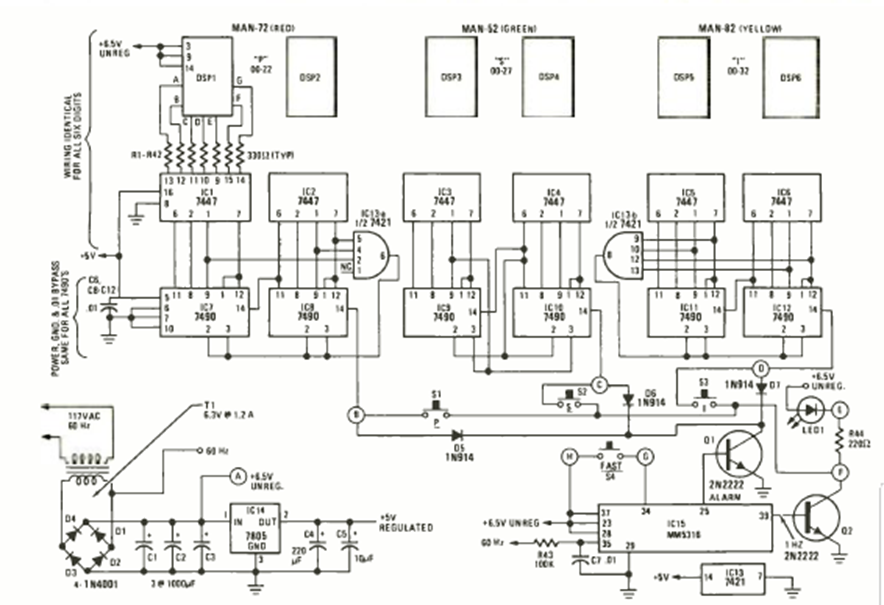 Found in a November 1977 Radio Electronics magazine, this digital circuit was described in an article that taught how to assemble it. The 6-digit circuit is a clock.