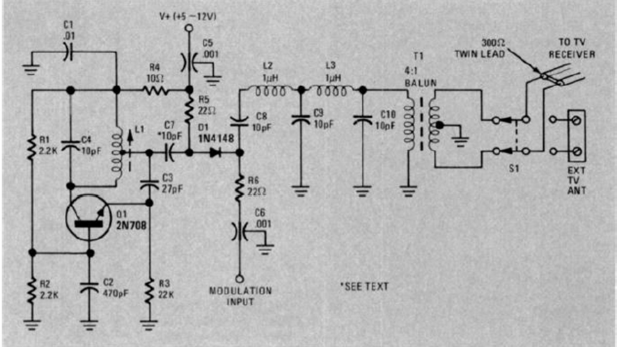 We found this circuit for video games in a Radio Electronics magazine from August 1977. The transistor can be any common RF type that reaches the desired signal frequency.