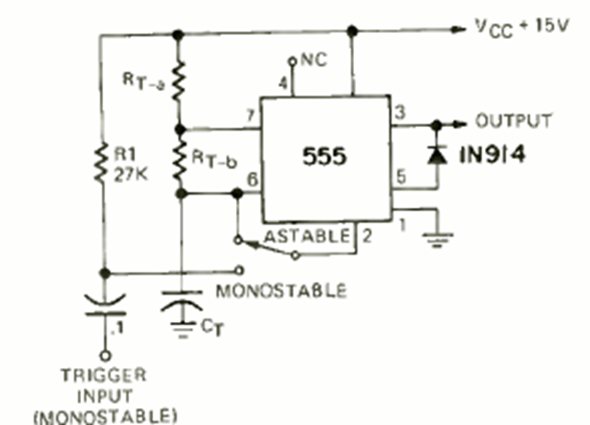 This interesting feature allows you to select astable or monostable operation of a 555. The circuit has component values according to the desired operation.