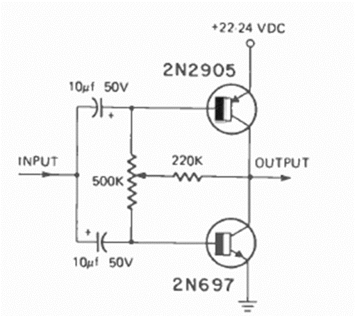 This unusual output stage was found in the October 1974 issue of Radio Electronics magazine. The circuit uses complementary general-purpose transistors and is low power.