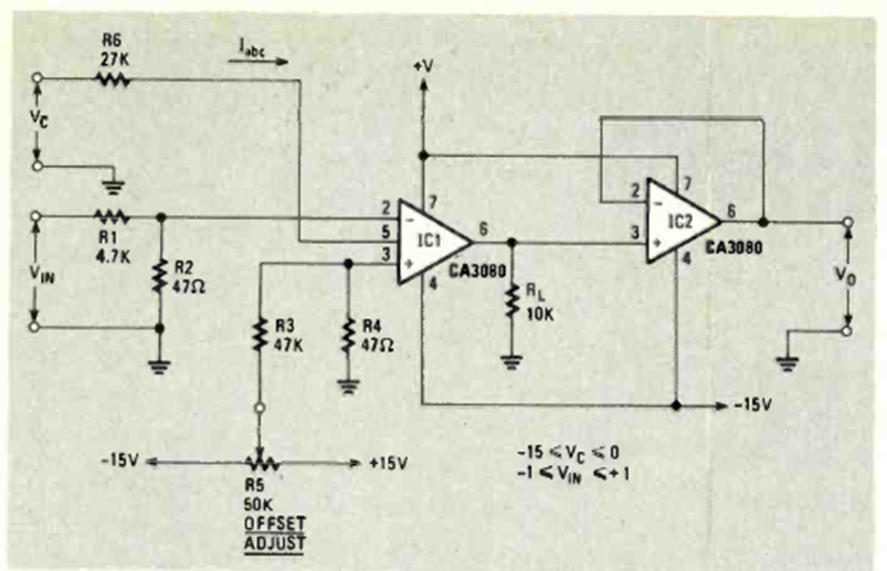 This amplifier circuit with gain between 0 and 96 was found in the December 1983 issue of Radio Electronics magazine. The power supply must be 15 V.