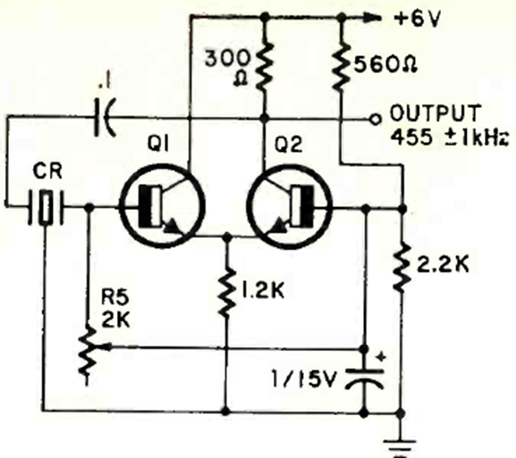 This oscillator using a 455 kHz ceramic filter was found in the May 1970 issue of Radio Electronics magazine. The circuit uses general-purpose transistors of the time and is accurate to 1 kHz.