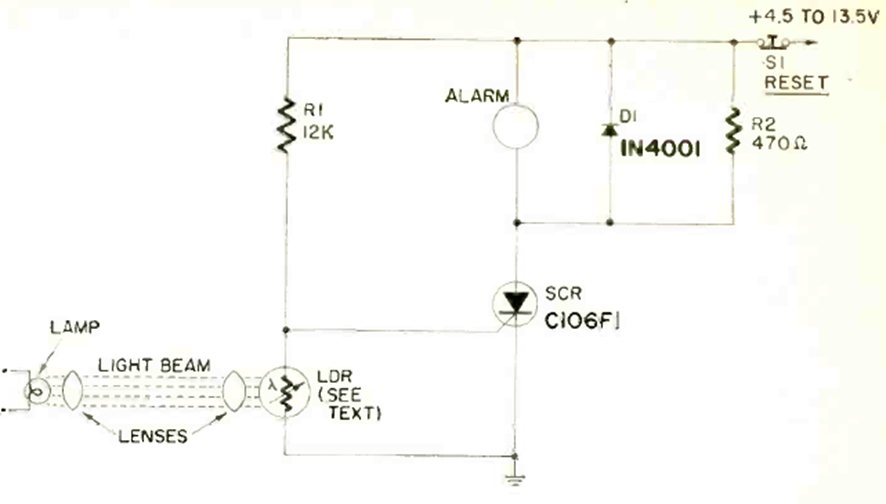 This sensitive passage alarm was found in the August 1971 Radio Electronics magazine. The light beam can be obtained from LEDs or a laser in a modern version.