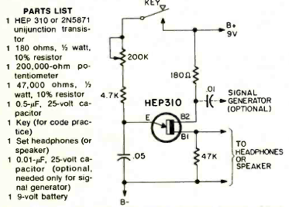 This simple circuit, repeated in many places in this section from many different sources, was published in the February 1972 issue of Radio Electronics magazine. Any unijunction transistor can be used. It can also be used for telegraphy practice purposes.