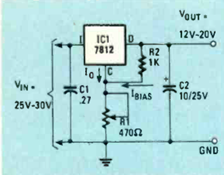 In the figure we have an improved method of varying the voltage of a 7812 regulator. The circuit is from Radio Electronics from July 1984. It can be applied to other regulators.