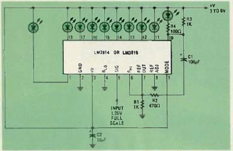 This circuit is from an October 1980 Radio Electronics magazine. The circuit indicates when the maximum voltage range set by the LM3914 exceeds its end.