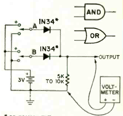 This circuit simulates the two gates with diodes that can be switched by a switch. The circuit is from a documentation from the 70s. The diodes are general-purpose germanium.