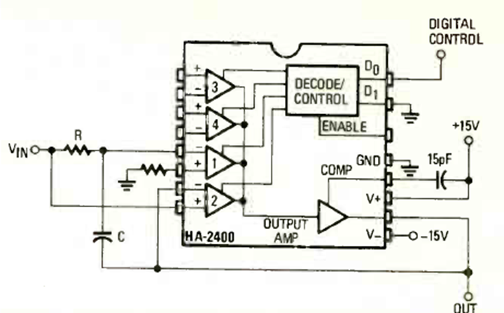 This circuit was found in the March 1980 issue of Radio Electronics magazine. It is based on the newly released LH2400. The circuit must be powered by a symmetrical power supply.