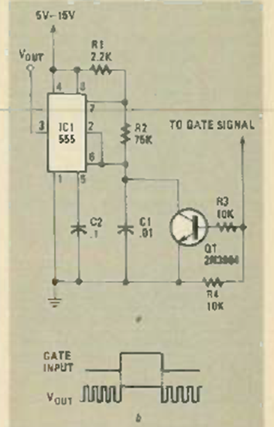 In the figure we have a different way of triggering a 555 oscillator. The circuit is from Radio Electronics from September 1984. The transistor is general-purpose.