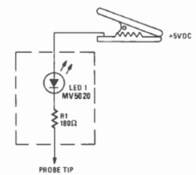 This two-component circuit was suggested by Radio Electronics magazine in its August 1977 issue. The LED can be any color, and the power comes from the circuit under test.